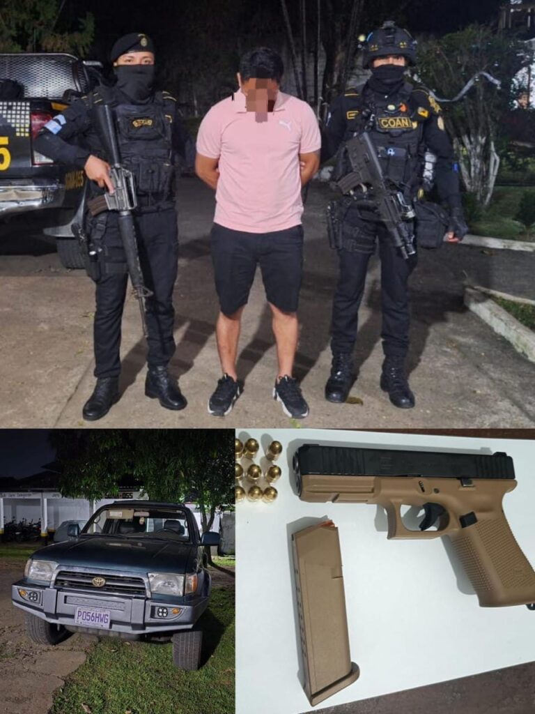 Mientras que, Rudy N, de 34 años, sindicado del delito de portación ilegal de arma de fuego, fue detenido en la calzada El Cementerio, zona 2 de Mazatenango, Suchitepéquez, Durante la diligencia al sindicado se le confiscó una pistola, una tolva, 17 municiones útiles y el vehículo donde se movilizaba.