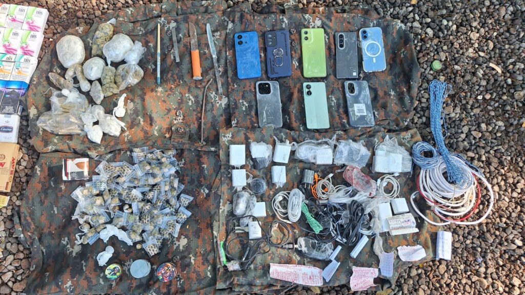 Se decomisaron 8 dispositivos móviles, 21 cargadores para celular, 4 cables para electricidad, 4 objetos punzocortantes, 1 panel solar, 1 router para señal de internet ilegal, 104 bolsas y 60 puros de supuesta marihuana, 2 bolsas con piedras de posible crack, 8 colmillos con presunta cocaína, 80 cajetillas de cigarrillos, y fragmentos de papel con números telefónicos de posibles víctimas de extorsión.