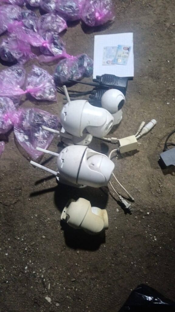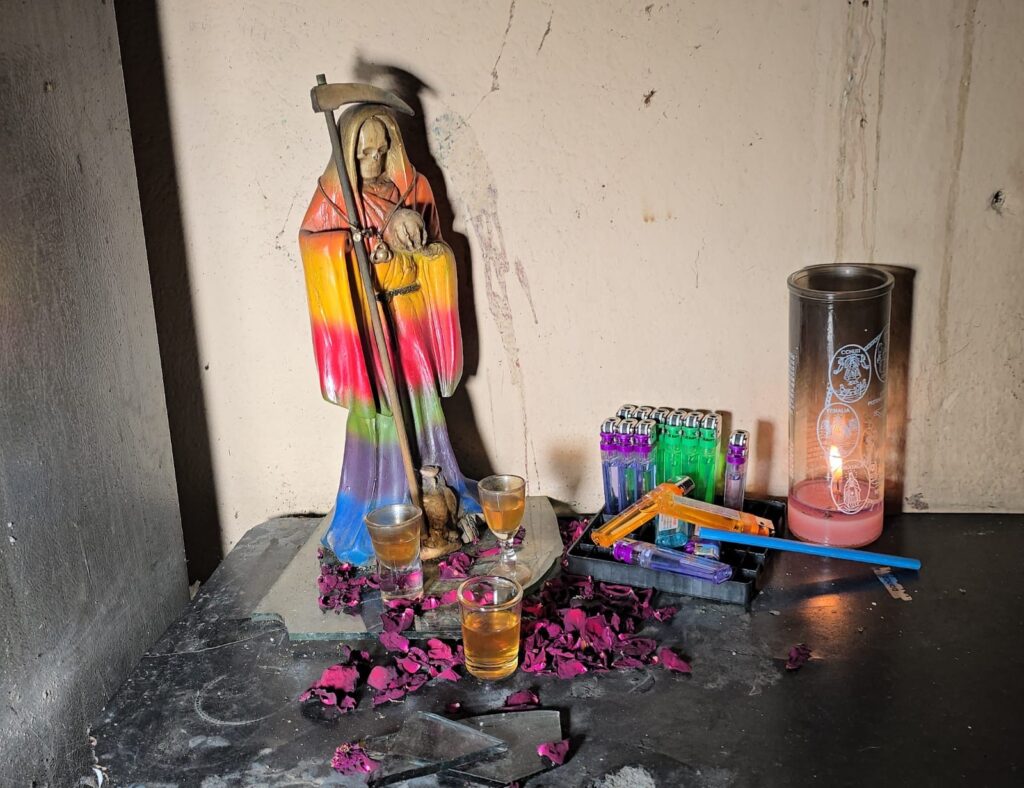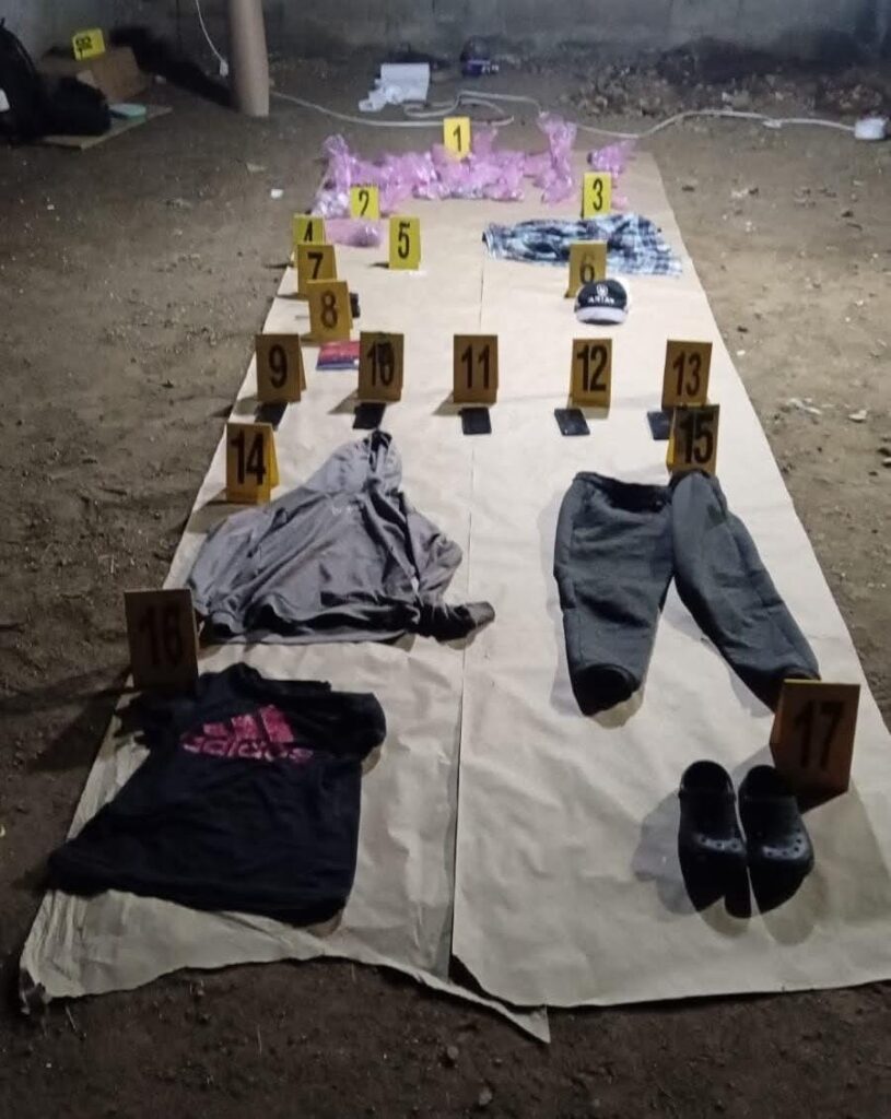 En la residencia allanada se confiscaron 338 bolsas con posible marihuana, cinco dispositivos móviles, dos radios portátiles, cámaras de videovigilancia, un casco, ropa con manchas de sangre y dos altares alusivos a la Santa Muerte. Los objetos ilícitos fueron debidamente embalados para su traslado y posterior análisis.