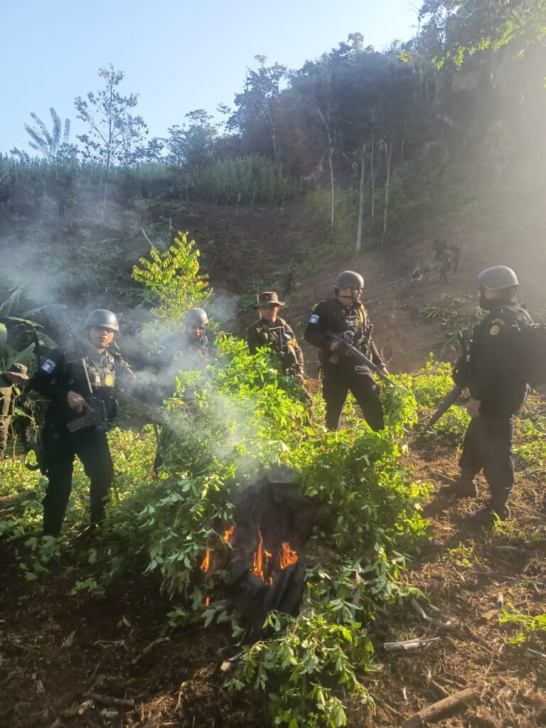 Agentes de la Subdirección General de Análisis de Información Antinarcótica (SGAIA) de la Policía Nacional Civil (PNC) erradicaron 637,160 arbustos de hoja de coca durante operativos realizados en coordinación con soldados del Ejército de Guatemala en áreas montañosas del municipio Chahal, Alta Verapaz.