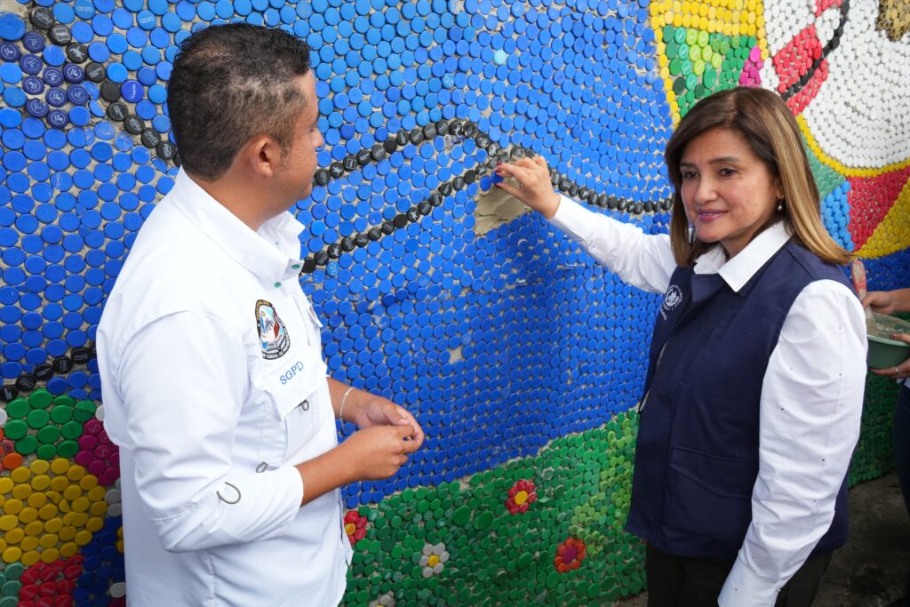 Como parte de la actividad simbólica, la Vicepresidenta y la Viceministra colocaron material reciclado en uno de los murales, destacando el compromiso institucional con la protección del medio ambiente y la prevención de la violencia desde el trabajo comunitario.