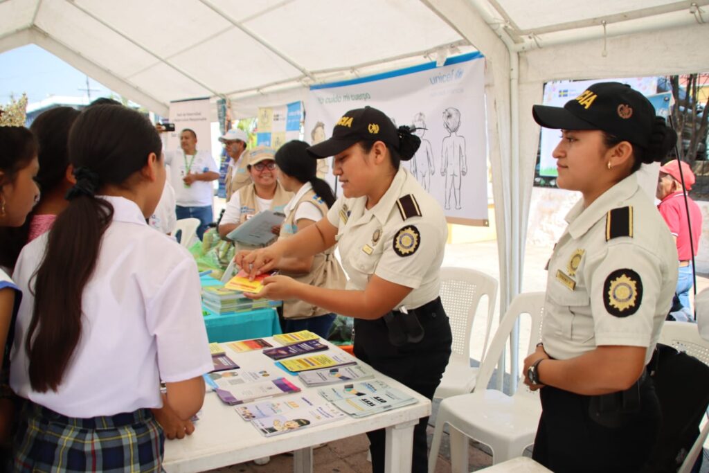 Agentes de la Subdirección General de Prevención del Delito (SGPD) de la Policía Nacional Civil (PNC) realizan la feria lúdica “Aprendiendo reivindico mis derechos” en el marco del Día Internacional de la Mujer y el Día Nacional de la No Violencia contra la Niñez. Este evento se realiza en el parque central de la cabecera departamental de Escuintla.