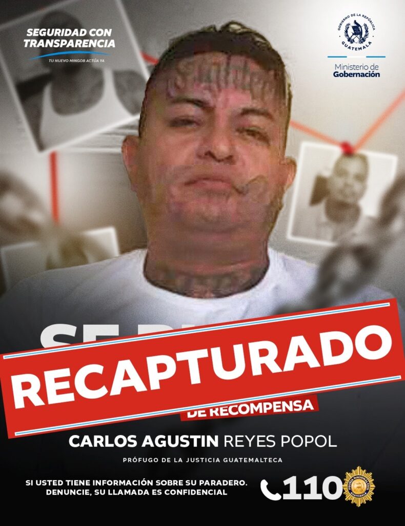 La Policía Nacional Civil (PNC) reporta la recaptura del privado de libertad Carlos Agustín Reyes Popol, alias “Jocker”, quien permanecía prófugo de la justicia desde octubre del año pasado. Esta persona se fugó del Centro de Detención para Hombres Fraijanes 2, junto con otros 19 terroristas del Barrio 18 hasta el día de hoy, cuando fue arrestado durante un operativo estratégico en San pedro Ayampuc, Guatemala, desarrollado por la División Nacional Contra el Desarrollo Criminal de las Pandillas (DIPANDA) de la PNC.