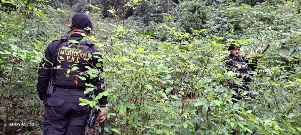 Policías de la Subdirección General de Análisis de Información Antinarcótica (SGAIA) de la Policía Nacional Civil (PNC) localizaron y erradicaron en áreas montañosas de la aldea Sebila, Livingston, Izabal 25,634 arbustos de hoja de coca en fase de aprovechamiento con un avalúo de Q256,340.